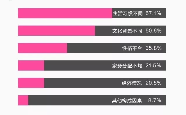 63.7%的太太表示跟父母偶爾會有摩擦。兩個不同時代出生的人,受到生活環(huán)境、教育程度等等影響,難免會有想法不一致、發(fā)生矛盾的時候。而在于婆婆相處的過程中,67.1%的太太們認為發(fā)生摩擦的最大的原因源自于生活習慣上的不同。