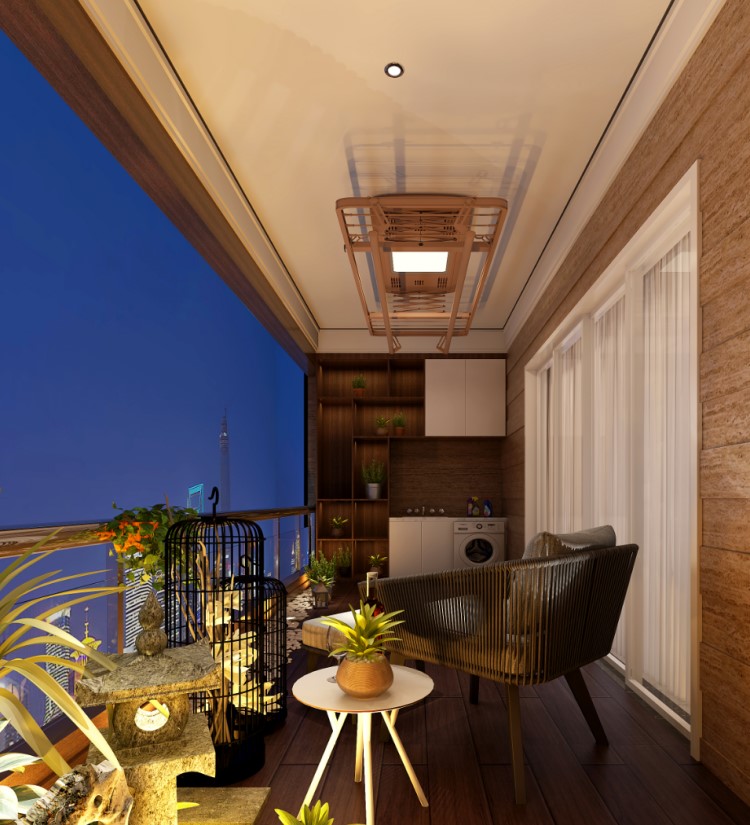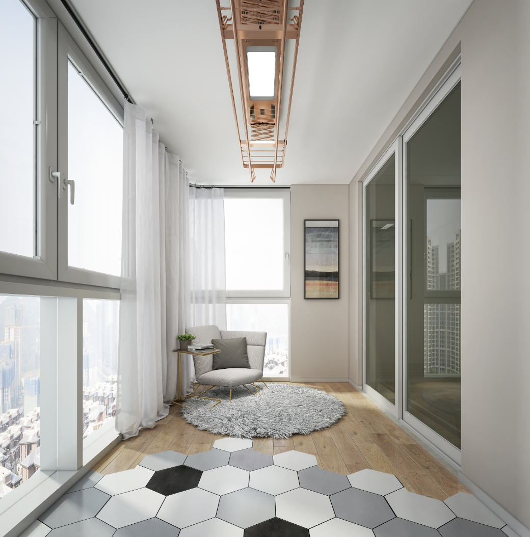 在本次金企鵝美居設計大賽中,一等獎設計師曾炎威將陽臺原有的護欄,改為上部可推拉式落地窗,且不影響采光通風的條件下也保證了業主的私密性及安全感。在空間布置上以地面材料的形式劃分為休閑區和工作區。休閑區地面為仿實木木紋磚,工作區域為黑、白、淺灰三種顏色的六角磚,黑白灰與原木肌理的交織使空間營造出的一種生機與美感,墻面的米黃暖色基調,融入好太太智能晾衣機,實用、簡約,展現陽臺的無限可能。
